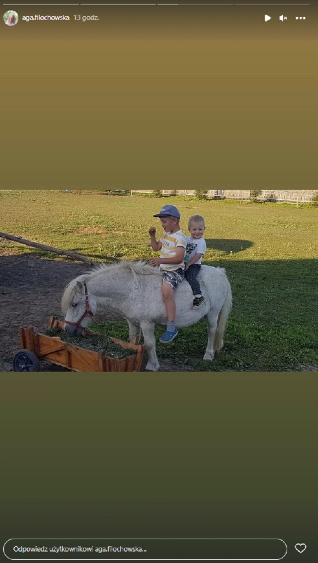 Agnieszka Filochowska prowadzi konto na Instagramie, gdzie od czasu do czasu publikuje urocze, rodzinne kadry. Na jednej z instagramowych relacji zdradziła, jak jej podopieczni spędzają czas na świeżym powietrzu. Migawka aparatu uchwyciła moment, w którym chłopcy siedzą na małym koniu. Uśmiechy na ich twarzach wskazują na to, że w momencie wykonywania zdjęcia dopisywały im humory!