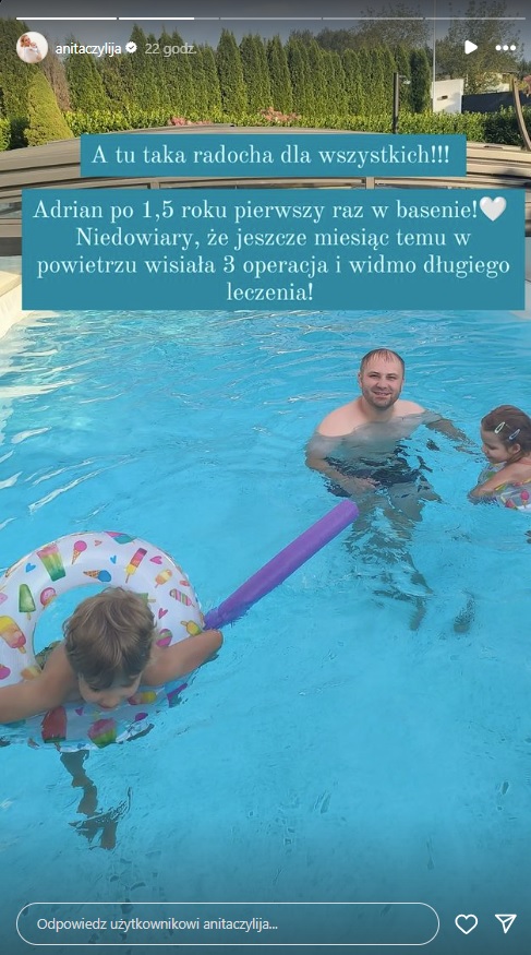 Na instagramowej relacji Anity wczoraj pojawił się rodzinny kadr, na którym widzimy jej męża i dzieci bawiących się w wodzie. Do fotografii dodała krótki komentarz, w którym przy okazji zdradziła, że jej ukochany powoli wraca do zdrowia po wypadku, do którego doszło w ubiegłym roku i jego konsekwencjach.