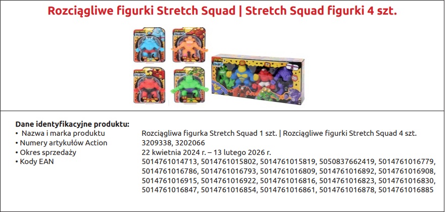 Artykuły, o których mowa, noszą nazwę: Rozciągliwe figurki Stretch Squad 4 szt. Jednocześnie taką samą decyzje podjęto w sprawie pojedynczych figurek: Rozciągliwa figurka Stretch Squad 1 szt.