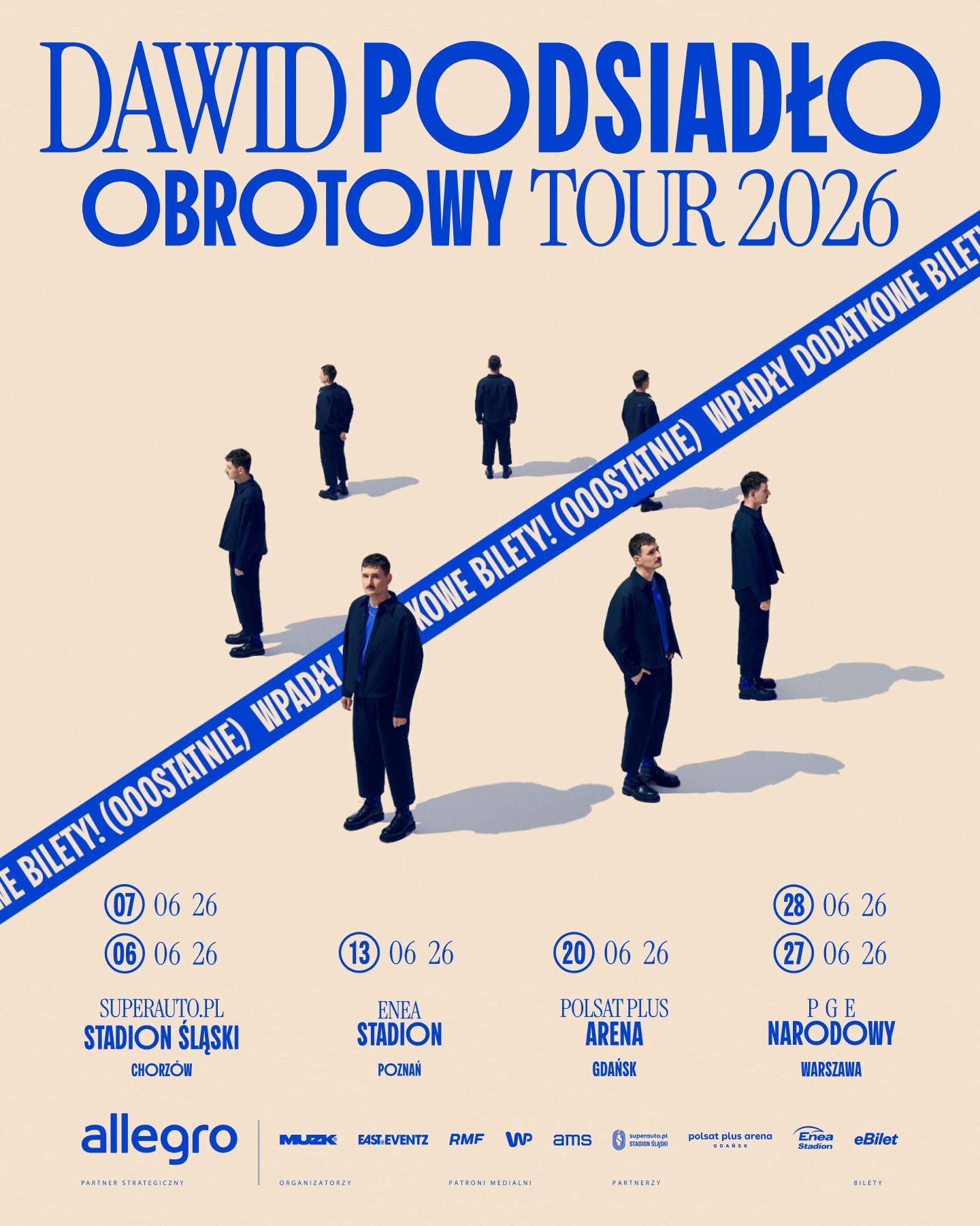 Na trasie OBROTOWY TOUR 2026 Dawid Podsiadło zagra koncerty na stadionach w Chorzowie, Poznaniu, Gdańsku i Warszawie. Wszystkie dostępne w pierwszym ogłoszeniu bilety wyprzedały się na tyle szybko, że organizatorzy zdecydowali się dołożyć dwa dodatkowe koncerty, które również zostały wyprzedane. W efekcie OBROTOWY TOUR 2026 już na długo przed startem stał się jedną z największych i najszybciej sprzedających się tras koncertowych w Polsce. To ciąg dalszy historii, którą Dawid Podsiadło konsekwentnie pisze od lat. Jako pierwszy polski artysta samodzielnie wyprzedał PGE Narodowy, a później z sukcesem wypełniał również kolejne stadiony. Jego koncerty łączą rozmach, nowoczesną produkcję i niepowtarzalną atmosferę.