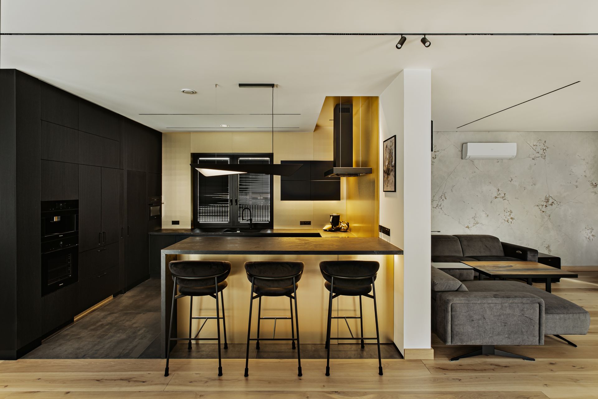 Architekt postawił na zestawienie głębokiej czerni, naturalnego drewna jesionowego i złotych akcentów, które pojawiają się choćby w detalach wykończeniowych czy okładzinach ścian. Wielkoformatowe płyty kamienne i spieki tworzą niepowtarzalny klimat i nadają wnętrzu ponadczasowego charakteru.