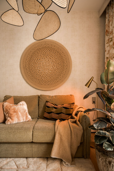 Poza tym apartament zdobią dzieła sztuki, które powstawały równolegle z projektem wnętrz. Od rzeźby Krzysztofa Renesa w holu, przez artystyczną tkaninę Sienny Palomy w salonie, aż po obrazy i tekstylia w innych pomieszczeniach – każdy element został stworzony z myślą o tej konkretnej przestrzeni, by nadać jej niepowtarzalny charakter.